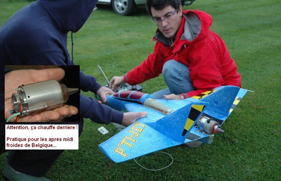 Je part donc chercher en Allemagne nos jouets: Mr Martin Lambert lui-même m'apprend à démarrer le réacteur. : Ca démarre au gaz et on lui fait prendre ses tours en soufflant dessus avec un sèche cheveux ? Damned, ça semble un peu plus compliqué qu’une turbine électrique. Heureusement qu’on a eu un cours et même une démonstration en vol faite par tom, son « pilote d’usine ». La simplicité de mise en œuvre et le peu de nuisance sonores de ce petit réacteur nous a frappé! Martin Lambert n’ayant fabriqué, à ce moment, que 10 Kolibris, nous repartons avec…. 20% de sa production mondiale. Ca nous donne un sentiment de pionniers. C’est valorisant, même si « pionniers + débutants » nous semble ambitieux.